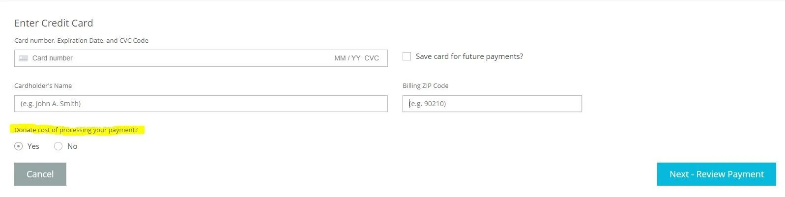 - When paying online via credit card, we ask that you donate the payment processing fee incurred. If the box is not selected, we are not able to accept payment via card.